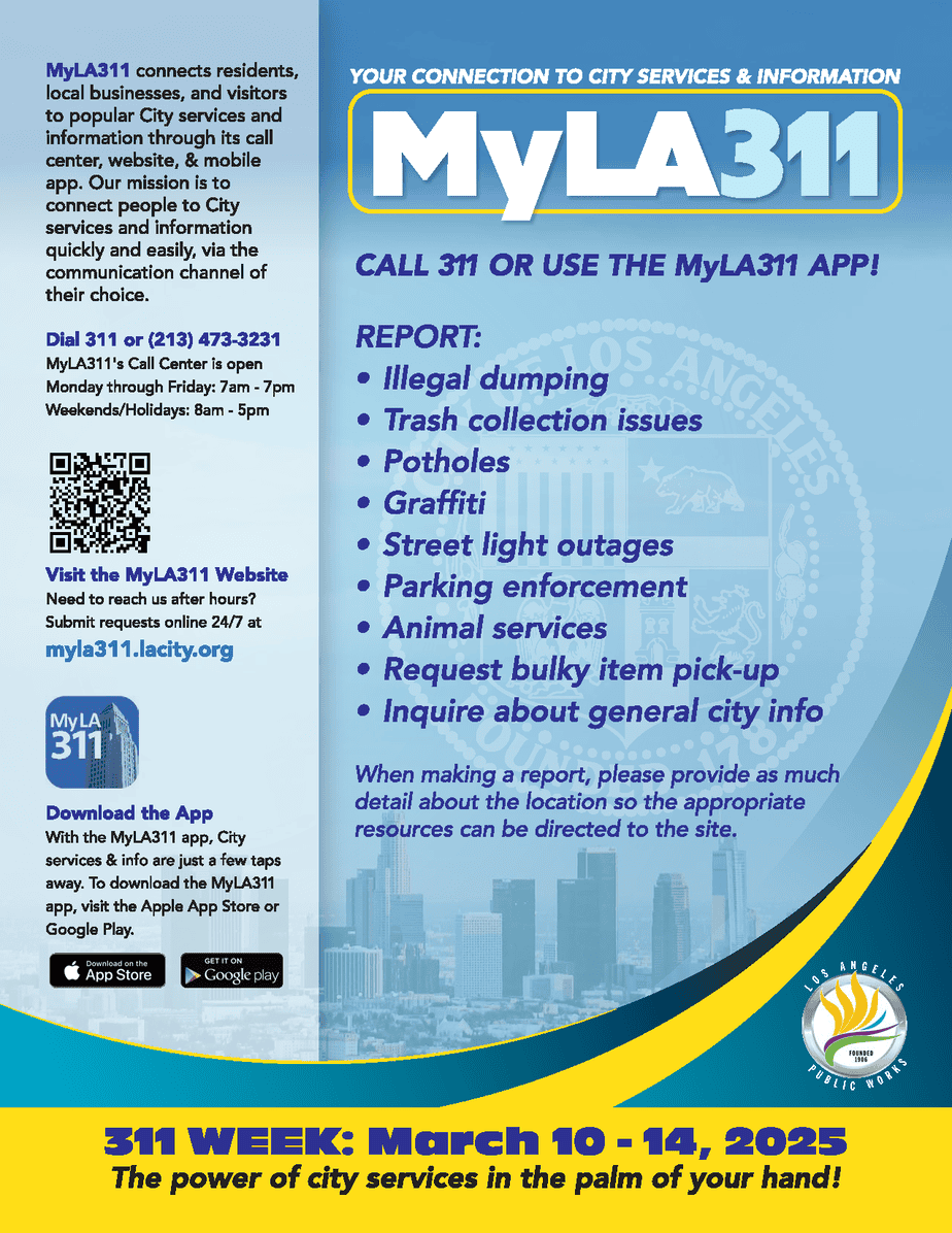 WSSM residents may not know that contacting the City of Los Angeles by calling 311 — or even better, downloading and utilizing the My311 mobile phone app — is the quickest and most efficient method of reporting concerns and issues that need to be addressed.